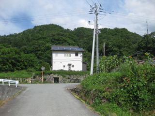 車が丁字路にさしかかるシーンです。正面に石垣とミラーが見えるのは同じですが、その上にある民家は映画では茅葺屋根の古い民家が建っていましたが、現在はトタン屋根の新しい民家が建っています。